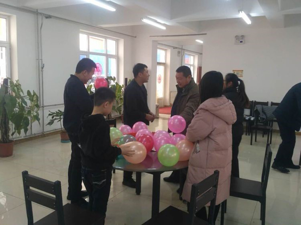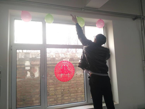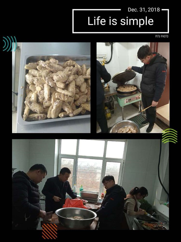 大家伙共同布置我們的會場,貼福字,掛條幅,換桌布,有些同事自己從家里拿案板與廚具。四星也是我們的家。