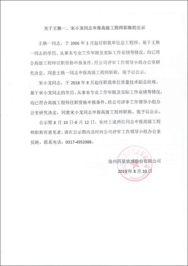關(guān)于王煥一、宋小龍同志申報高級工程師職稱的公示