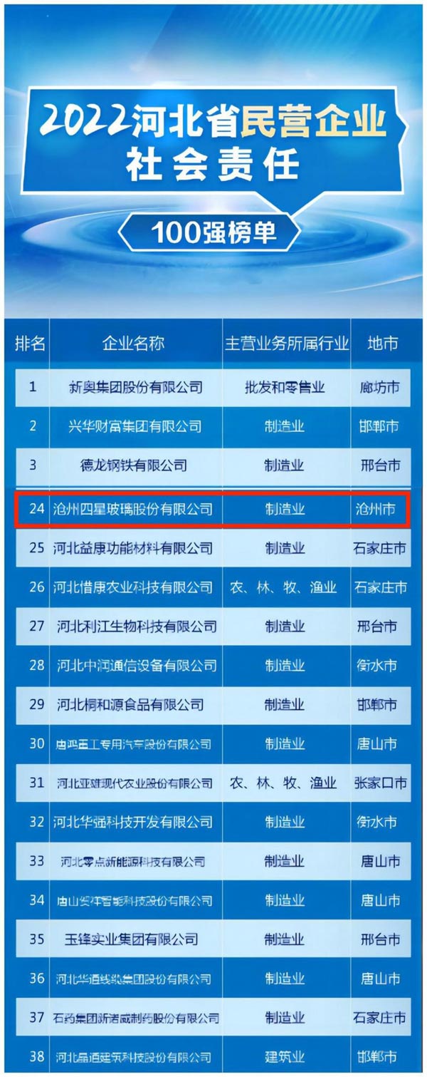 滄州四星玻璃入選2022年“河北省民營企業(yè)社會責任100強”榜單 |