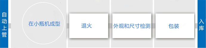 從玻璃管生產(chǎn)出來之后,通過輸送鏈單根輸送到制瓶車間,再通過機器手插到機器上開始進行生產(chǎn)。然后進入遠(yuǎn)紅外線電退火爐退火后,再進入在線攝像機檢測系統(tǒng)進行檢測,然后包裝入庫。